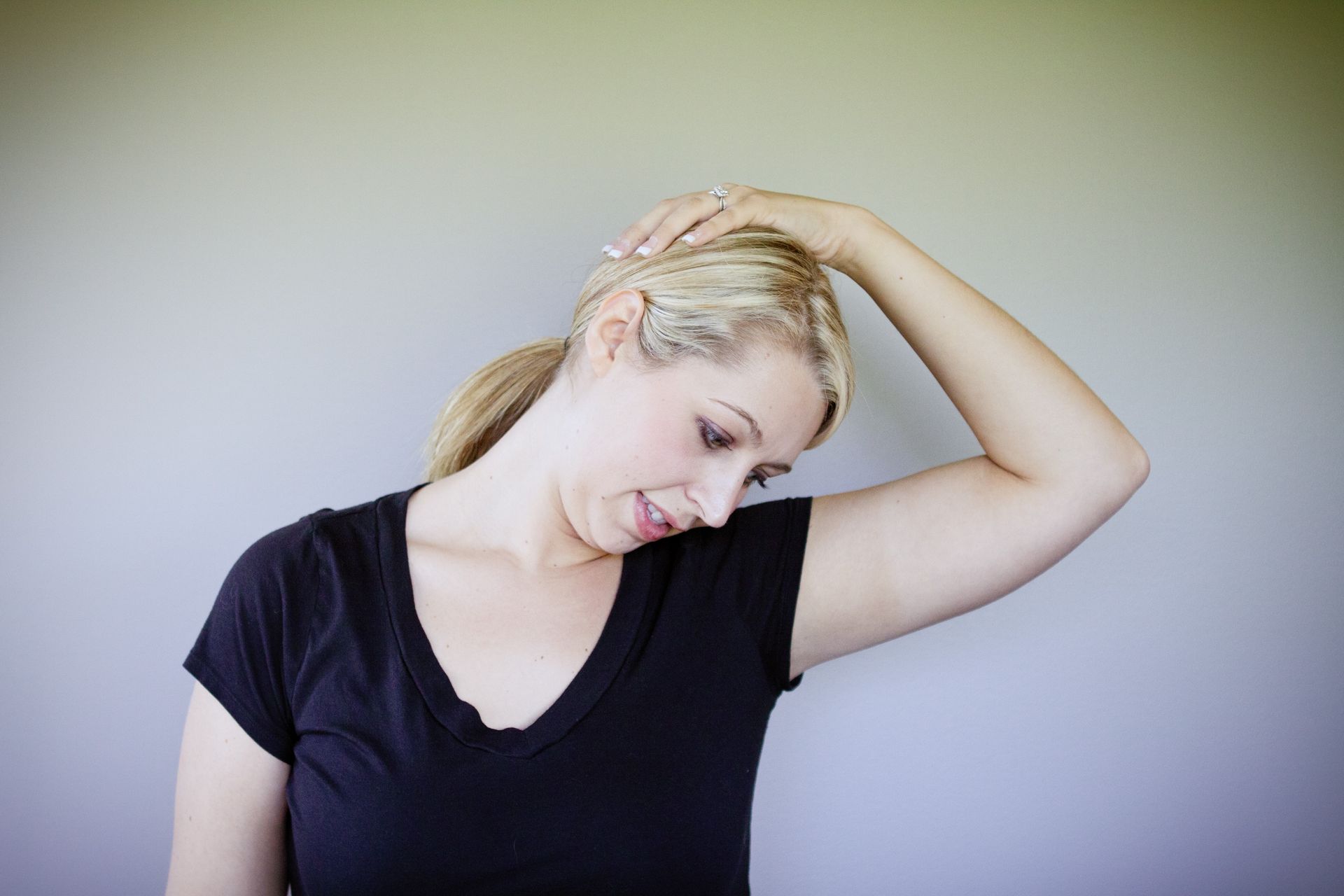 Place nose toward armpit and gently pull head forward until you feel the stretch. Hold for 30 seconds, repeat on other side.